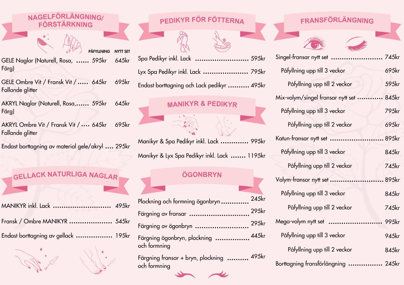 Våra specialiserade nageltekniker använder de senaste teknikerna och högkvalitativa produkter för att säkerställa att dina naglar inte bara ser vackra ut utan också känns starka och hälsosamma. Oavsett om du föredrar klassisk manikyr, vill ha nagelförstärkning eller önskar en mer kreativ nageldesign, har vi kompetensen att uppfylla dina önskemål.